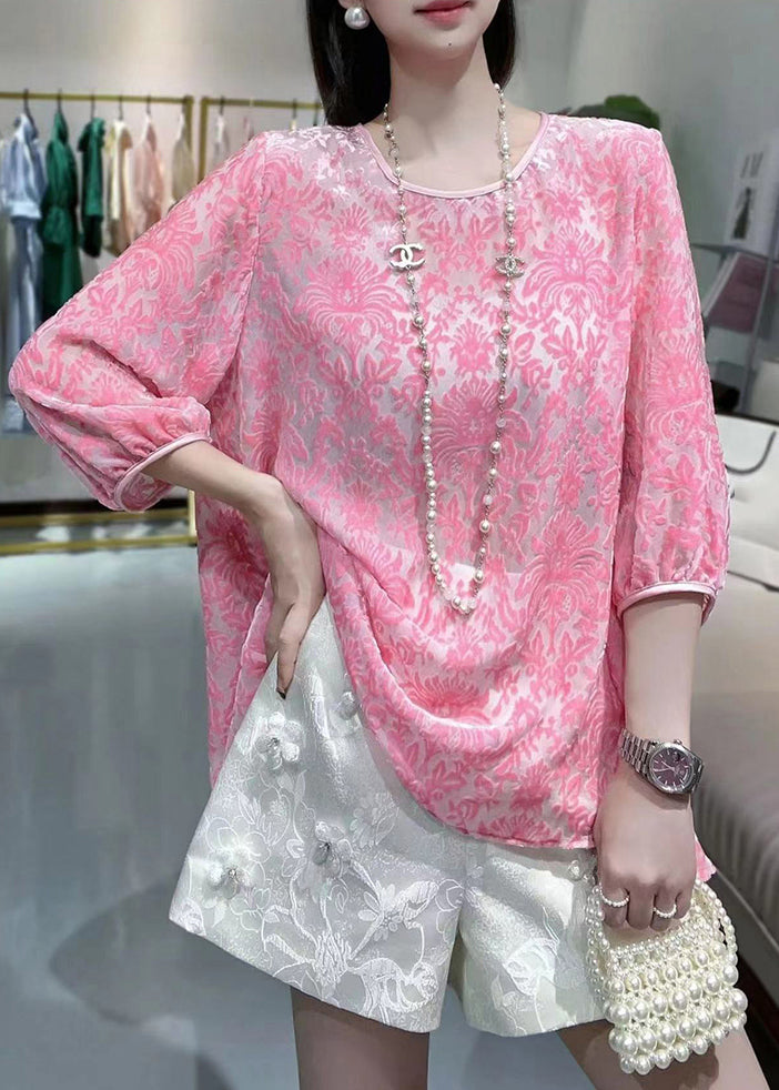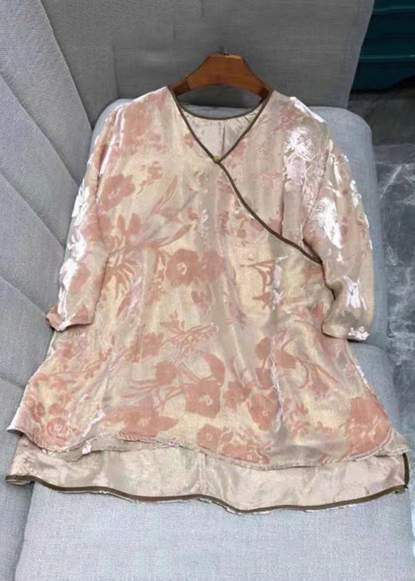 Jacquard Pink V Neck Lace Up Patchwork Silk Velour Tops Fall