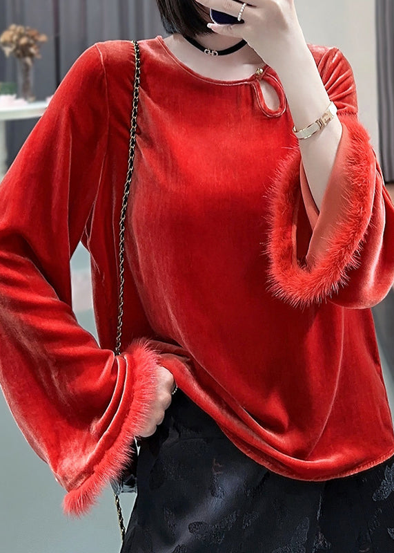 New Red O Neck Button Patchwork Silk Velour Top Long Sleeve