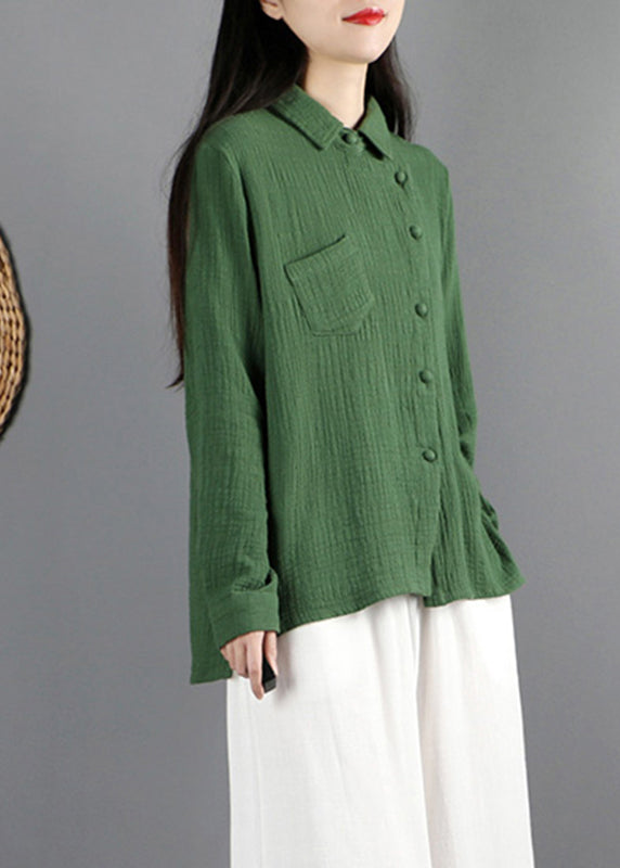 Casual Blackish Green V Neck Organza Patchwork Button Ramie Shirt Fall