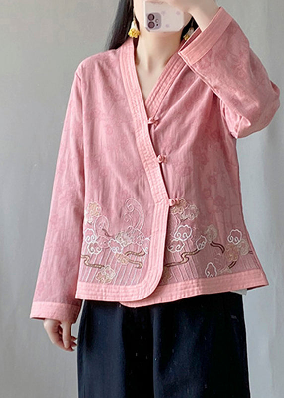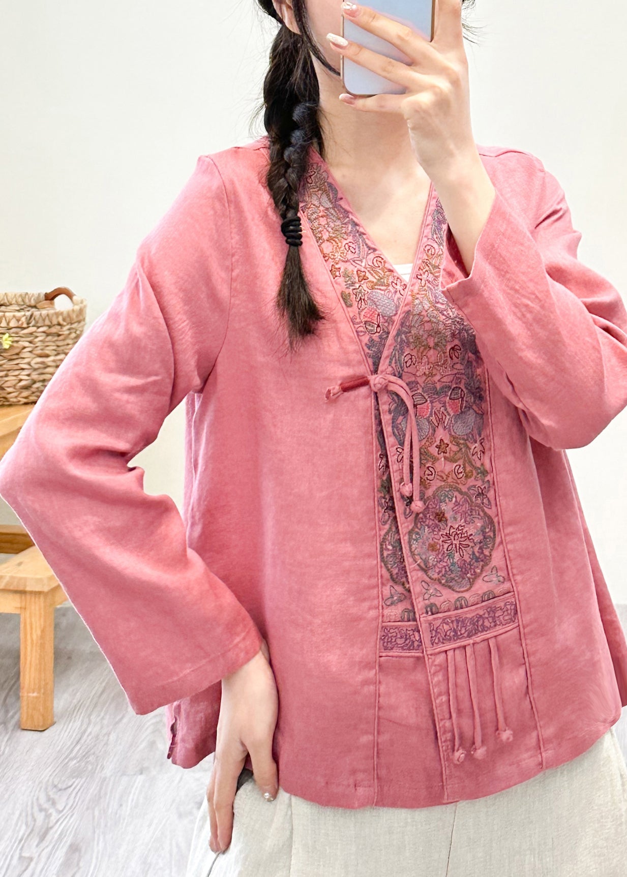 Women Pink V Neck Embroidered Floral Patchwork Linen Shirts Fall