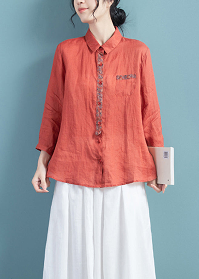 Vintage Brick Red Peter Pan Collar Print Ramie Top Long Sleeve