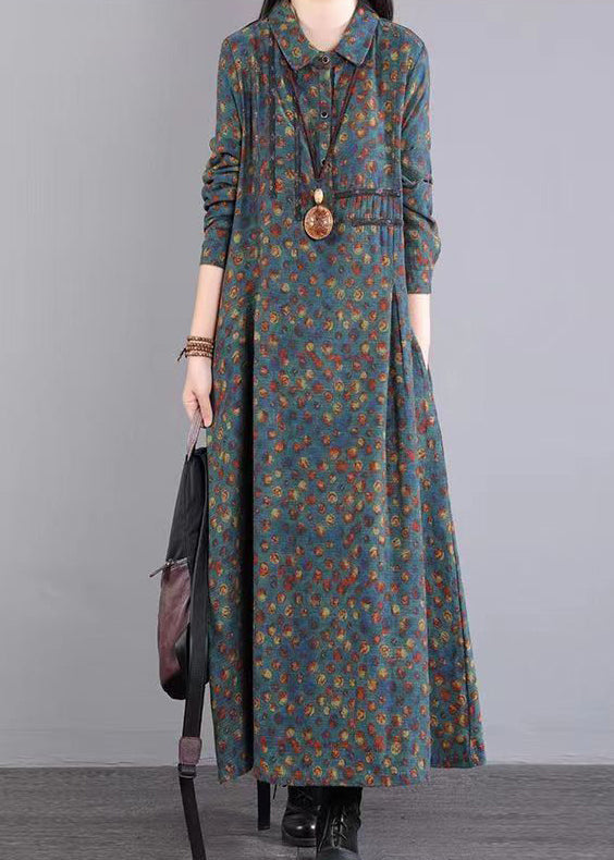 Green Pockets Patchwork Warm Fleece Maxi Dresses Peter Pan Collar Winter