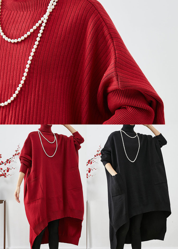 Red Oversized Knit Sweater Dress Turtle Neck Asymmetrical Batwing Sleeve