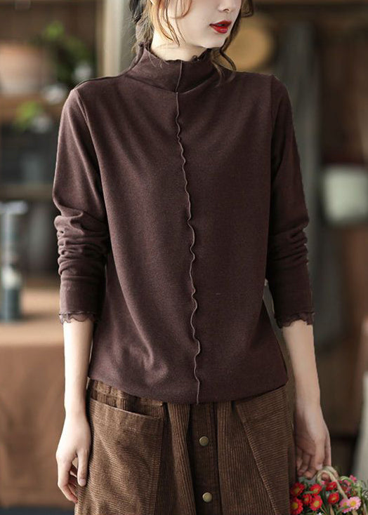 New Coffee Turtleneck Ruffled Patchwork Cotton Top Long Sleeve
