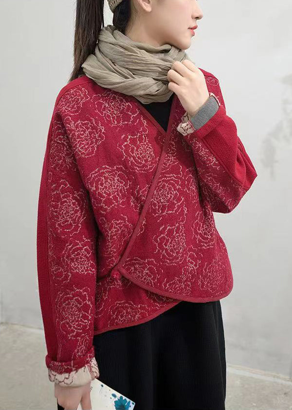 Red Button Patchwork Woolen Coats V Neck Long Sleeve
