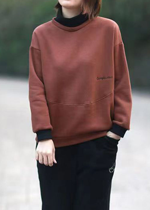 Simple Wine Red Turtleneck Patchwork Warm Fleece Sweatshirt Fall