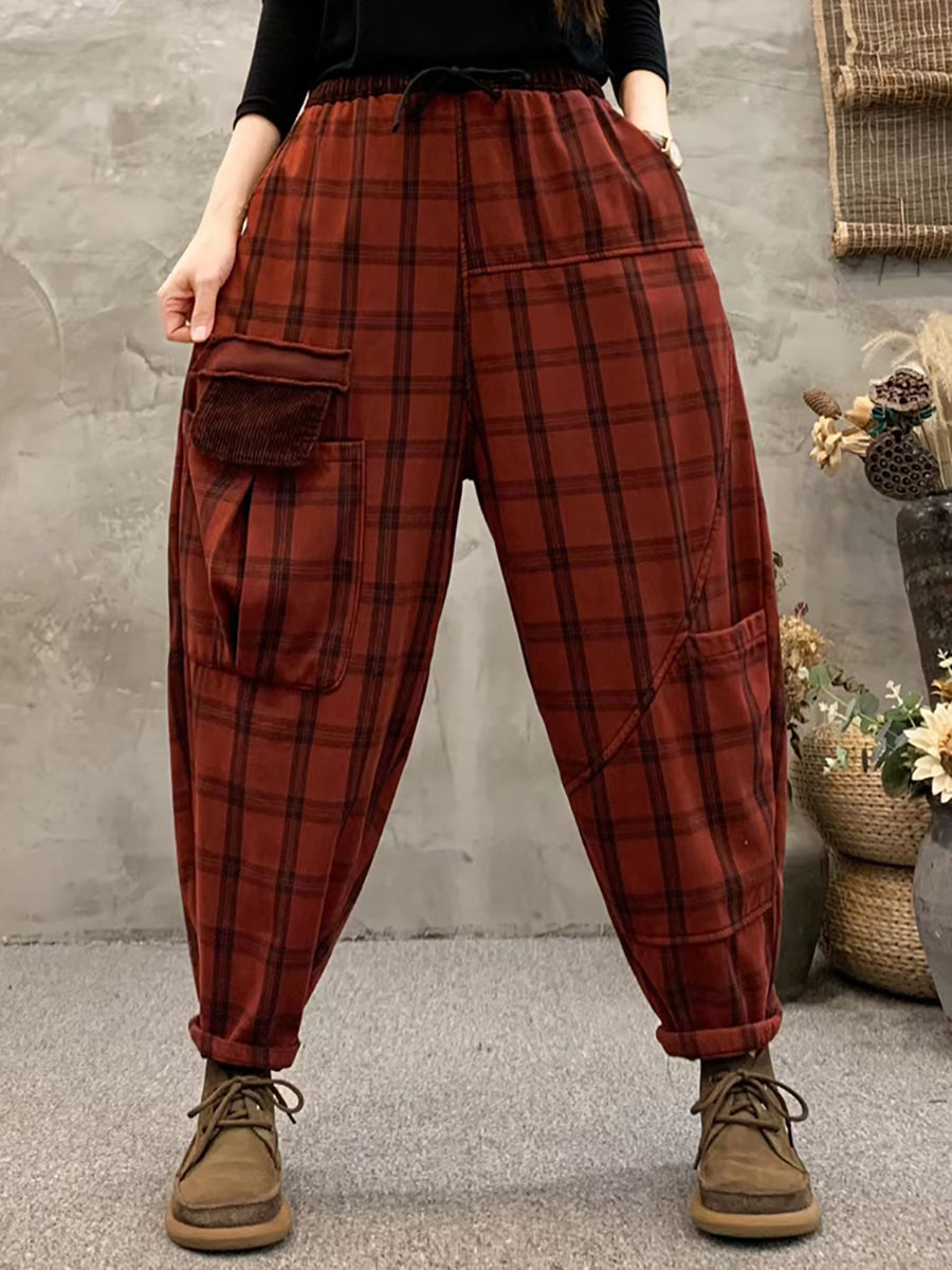 Plus Size Women Vintage Plaid Pocket Fleece-Lined Pants