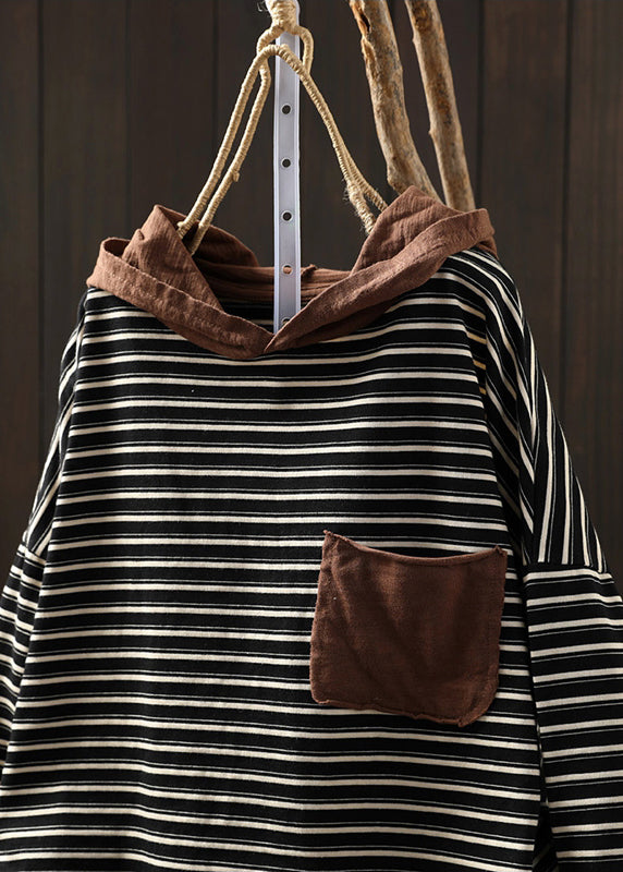 Black Striped Pockets Patchwork Cotton Blouse Tops Hooded Fall