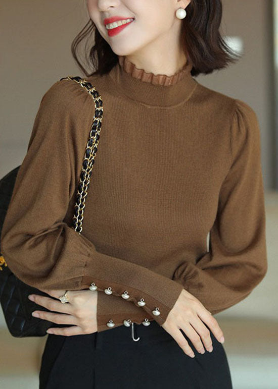 Women Caramel Ruffled Patchwork Wool Knit Pullover Spring