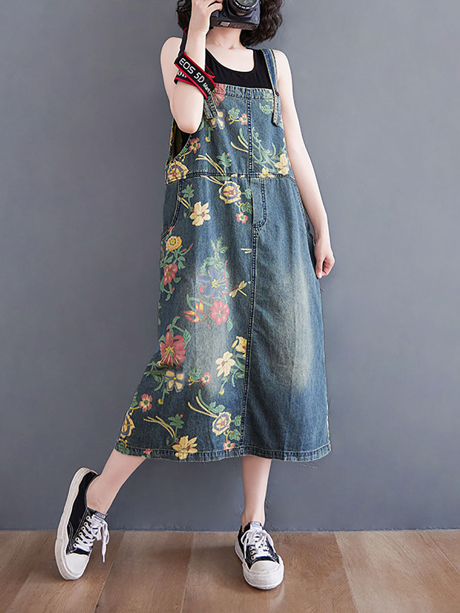 Casual Summer Flower Spliced Pocket Suspengder Dress