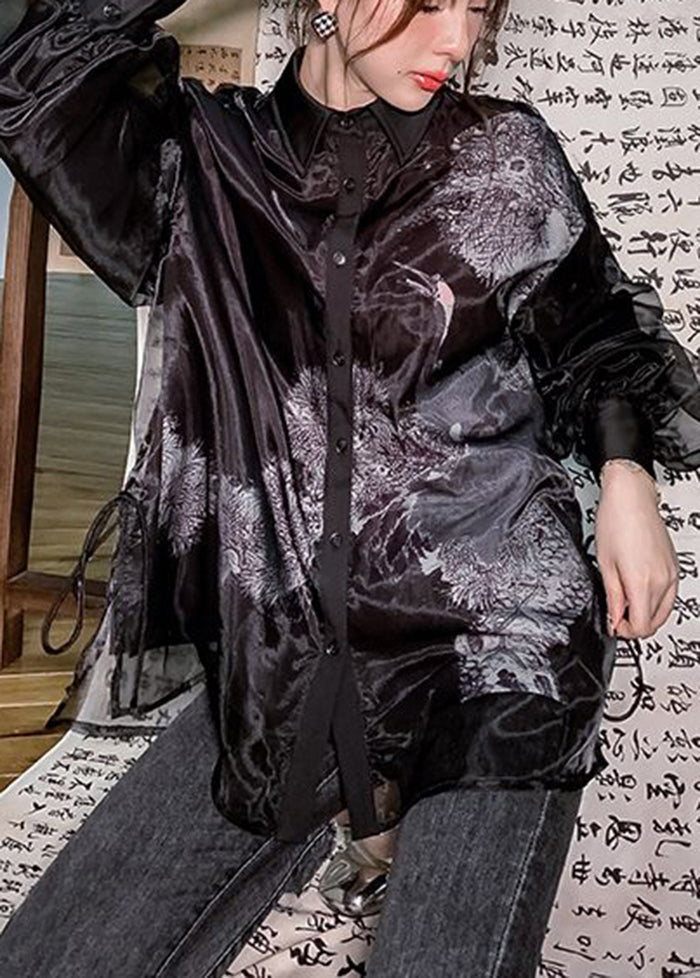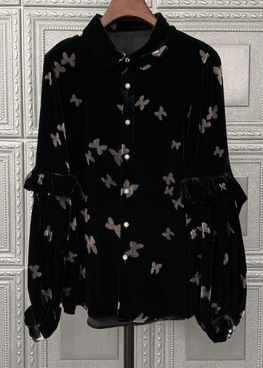 Beautiful Black Peter Pan Collar Print Button Velour Tops Fall