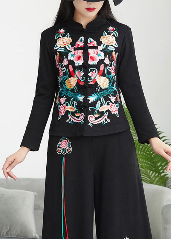 Chinese Style Black Stand Collar Embroideried Patchwork Cotton Top Fall