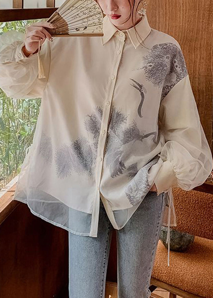 Stylish Black Layered Patchwork Red-Crowned Crane Print Tulle Shirts Fall