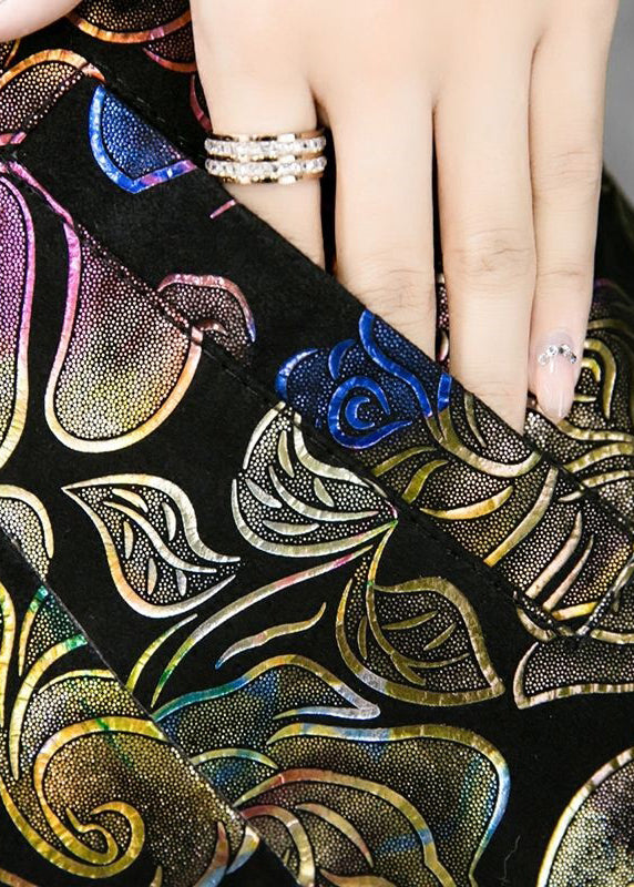 Elegant Black O Neck Button Patchwork Silk Velour Tops Fall