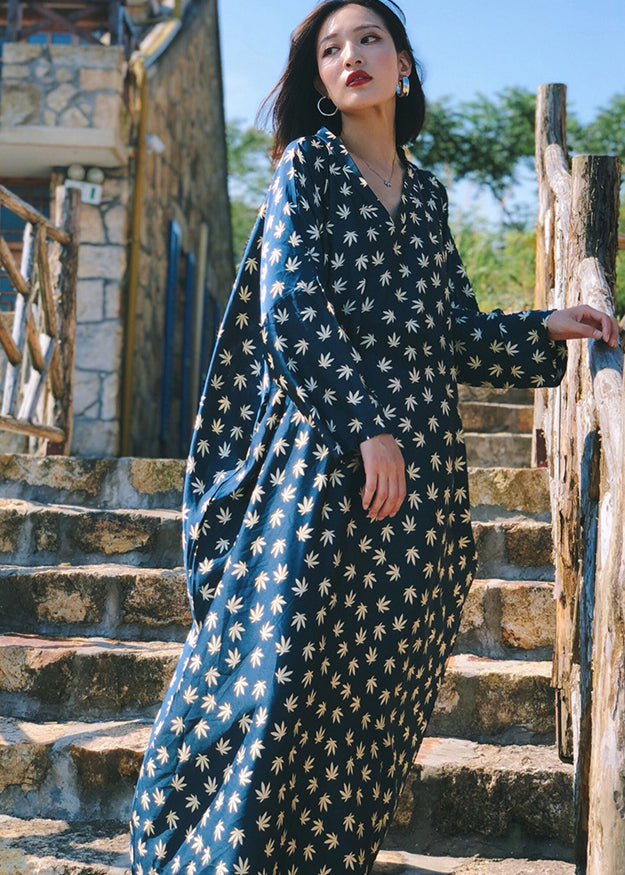Bohemian Navy V Neck Print Patchwork Silk Robe Dresses Fall