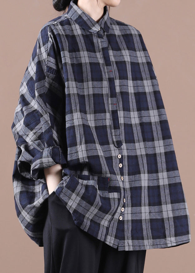 Grey Plaid Peter Pan Button Collar Pockets Cotton Shirt Long Sleeve