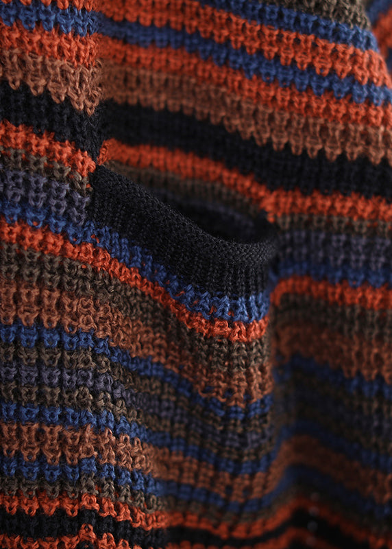 Plus Size O-Neck Thick Striped Pockets Knit Sweater Long Sleeve