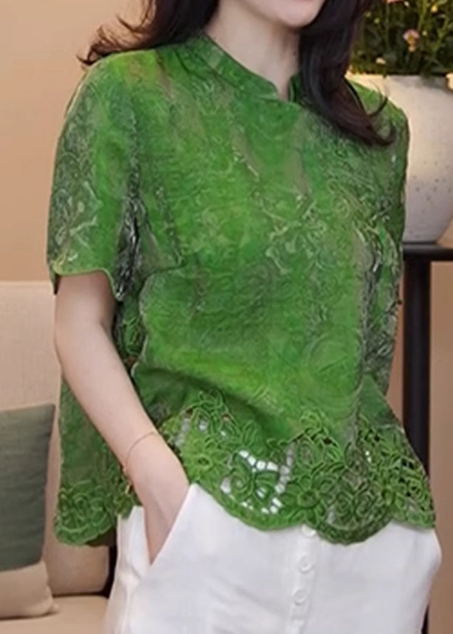 Chinese Style Green Stand Collar Hollow Out Cotton Blouse Summer