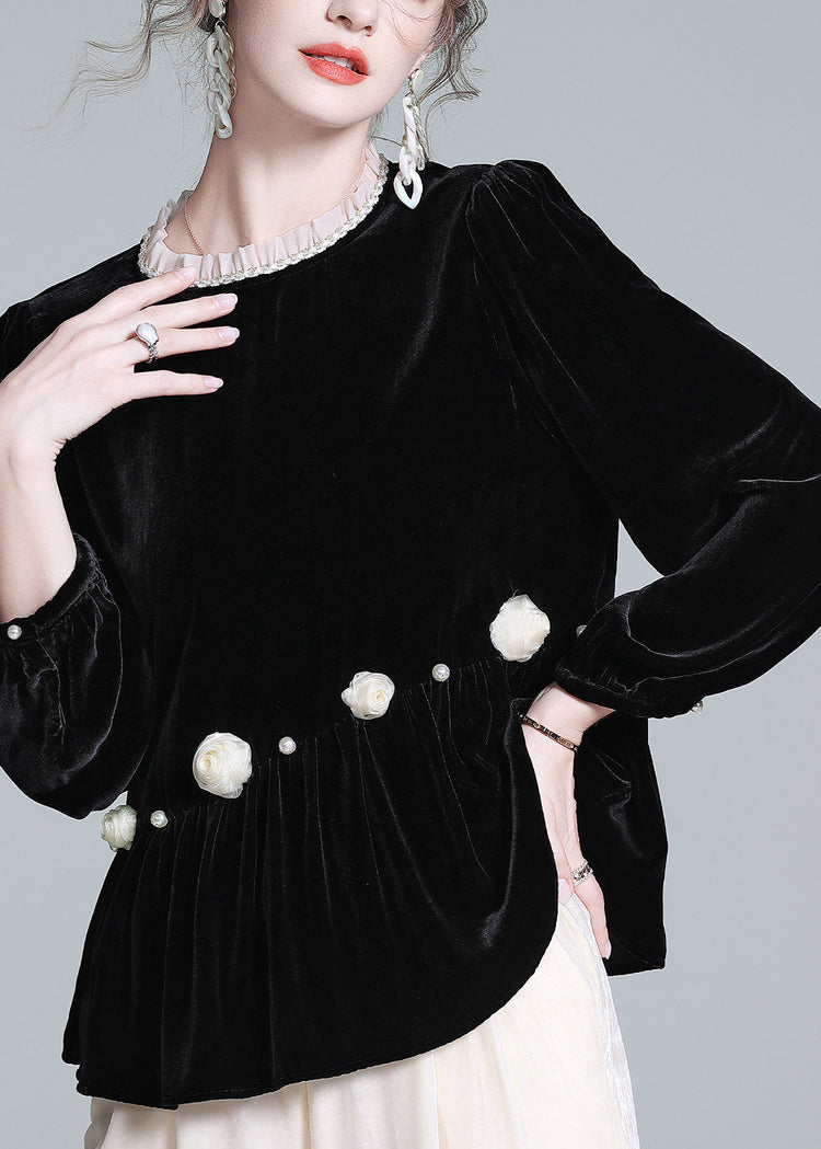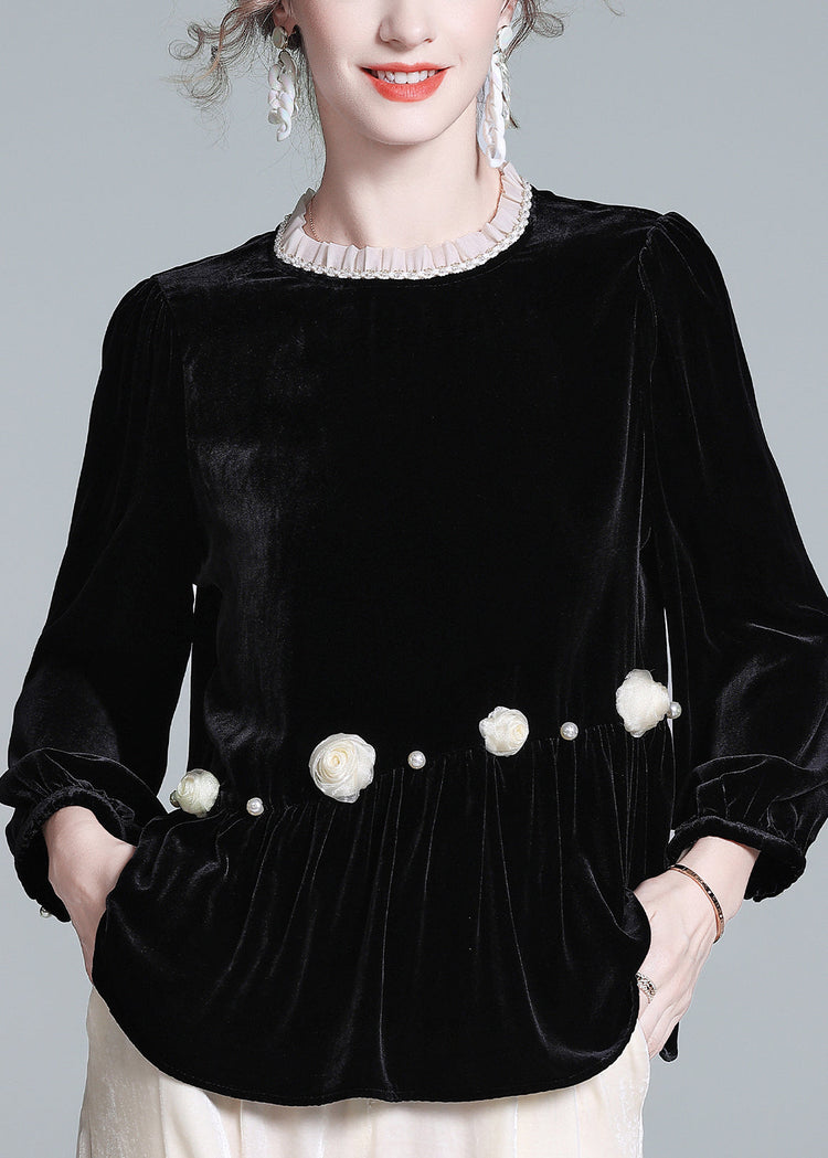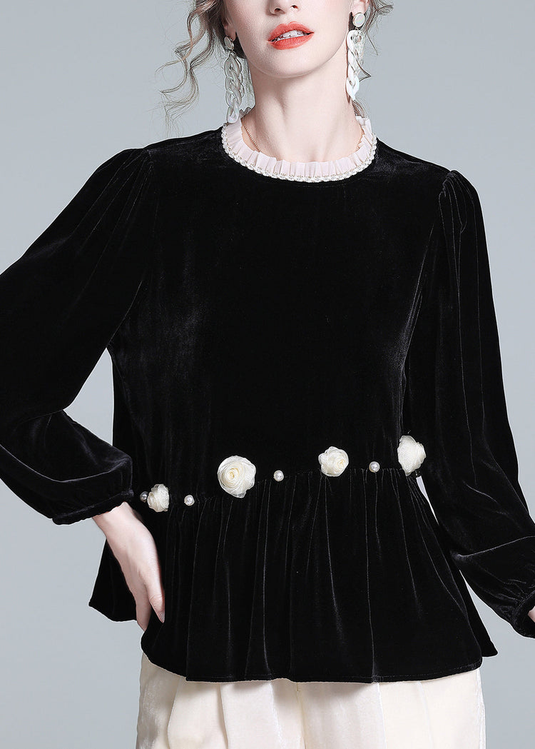 French Black O-Neck Floral Wrinkled Silk Velour Top Lantern Sleeve