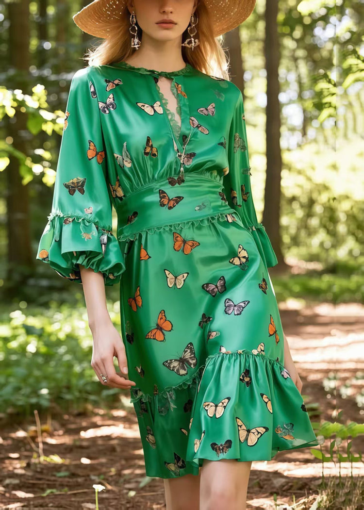 Fashion Tea Green Butterfly Silk Day Dress Lantern Sleeve