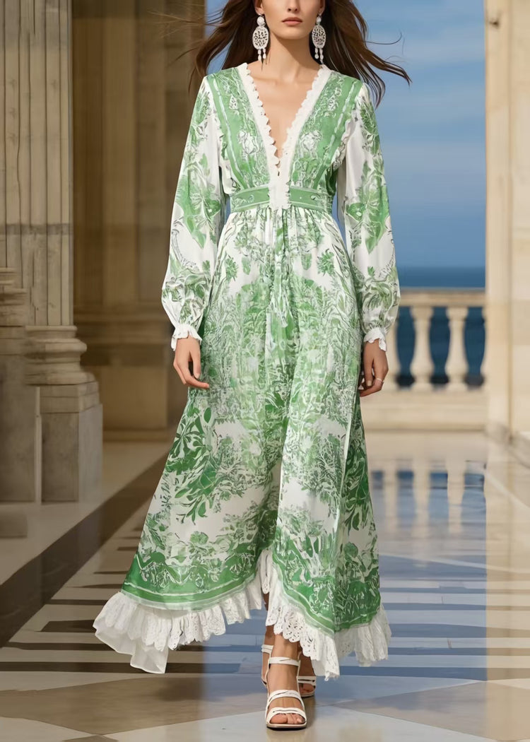 Modern Grass Green Print Patchwork Lace Long Dresses Spring