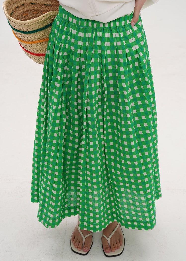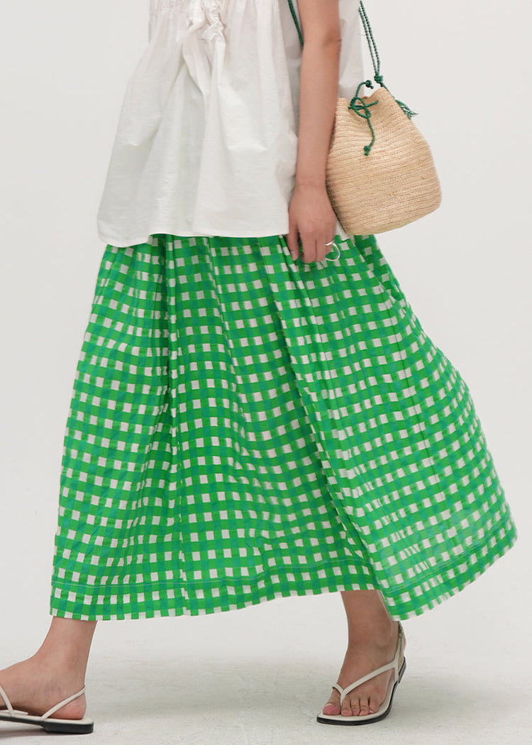 Art Green Plaid Elastic Waist Cotton A Line Skirts Summer