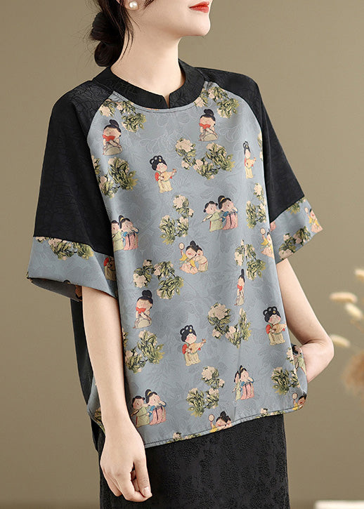 Art Sky Blue Print Patchwork Silk Oriental Tops Summer