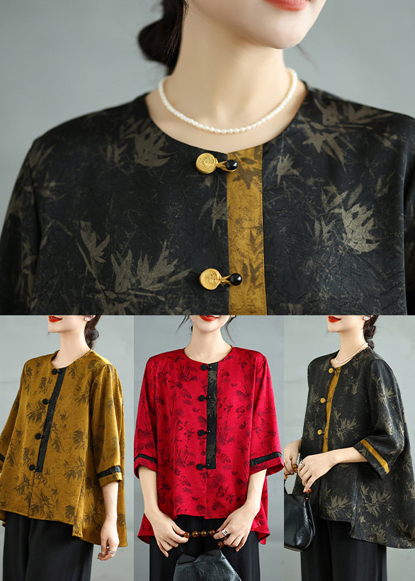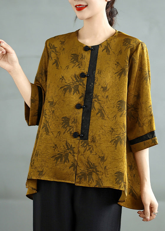 Fine Brown Chinese Button Print Silk Tops Bracelet Sleeve