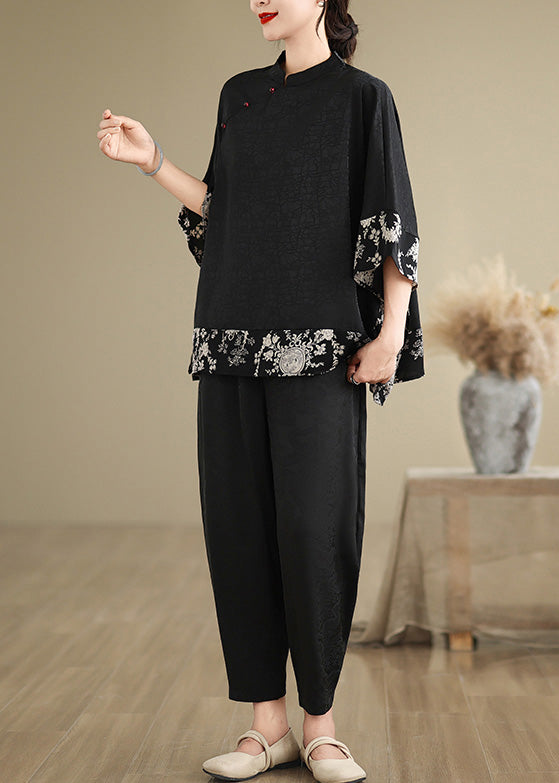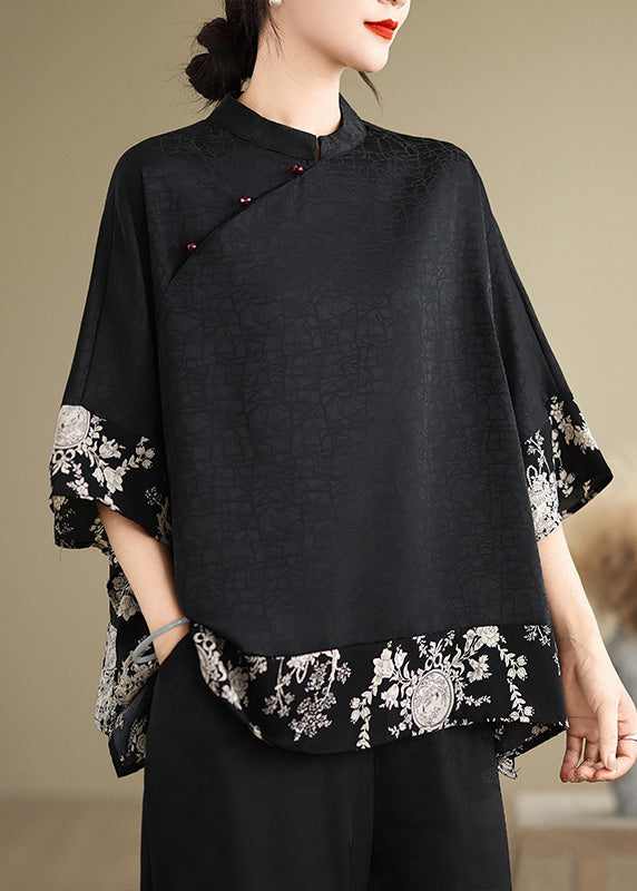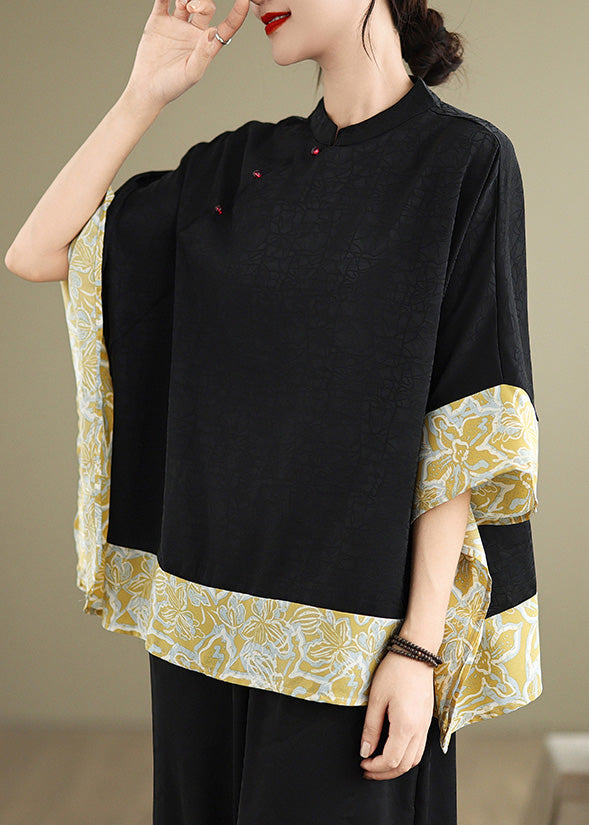 Chinese Style Black Mandarin Collar Patchwork Silk Tops Batwing Sleeve