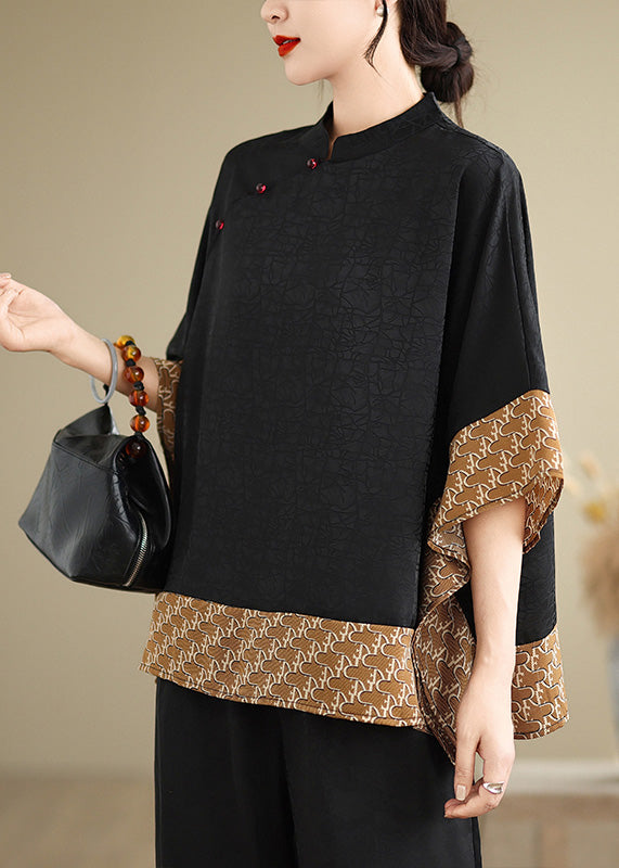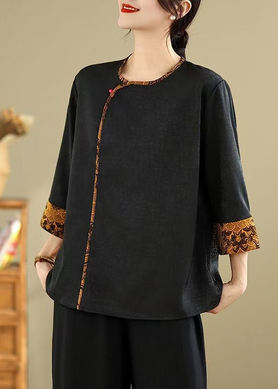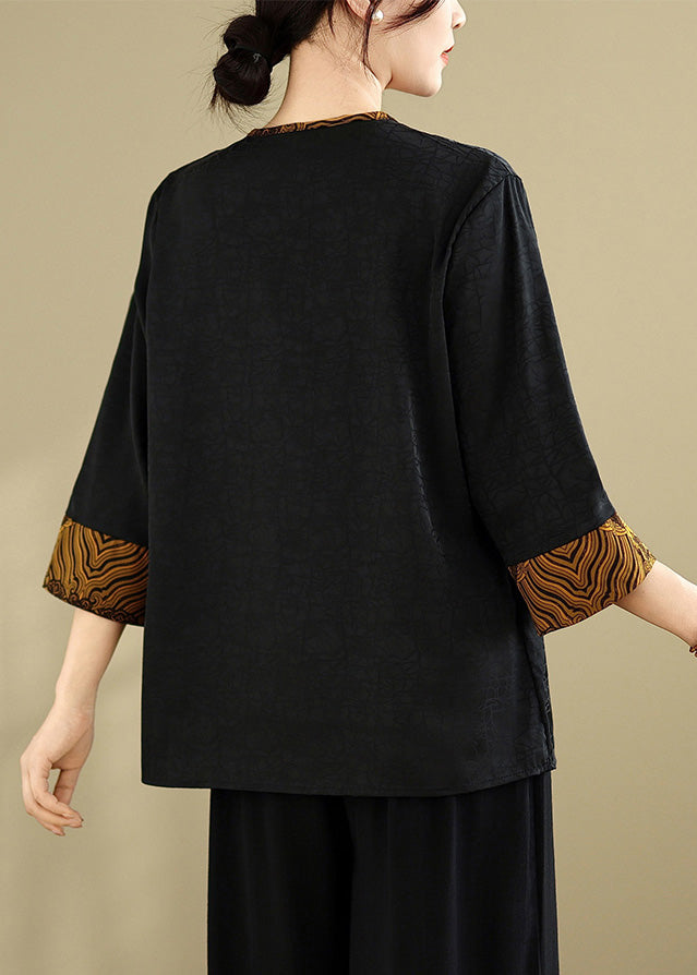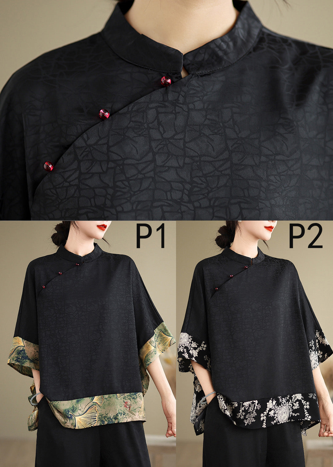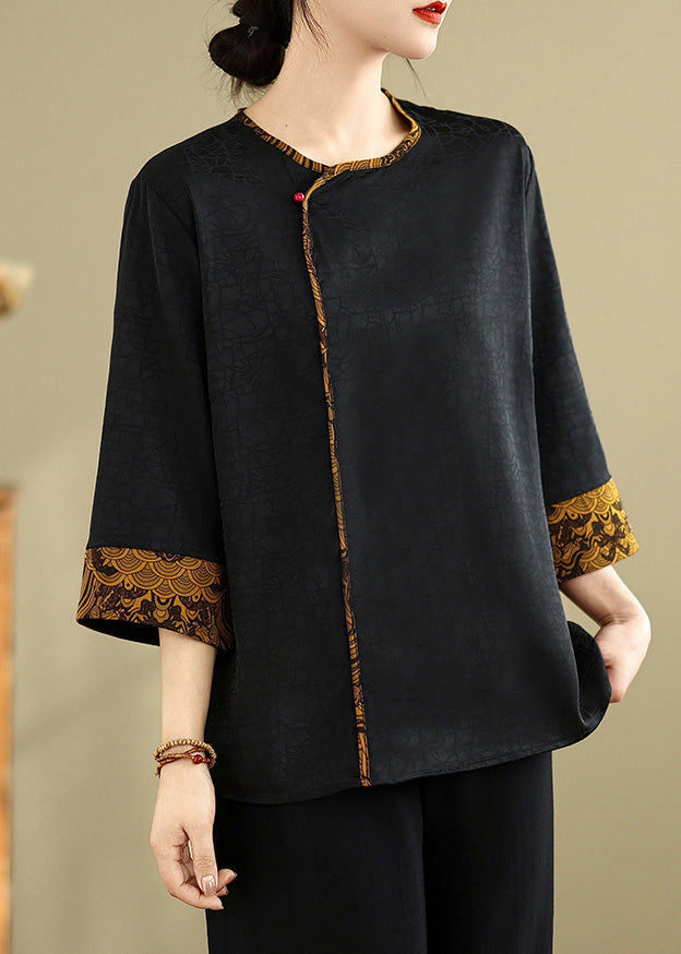 Vintage Black Mandarin Collar Patchwork Silk Shirt Summer