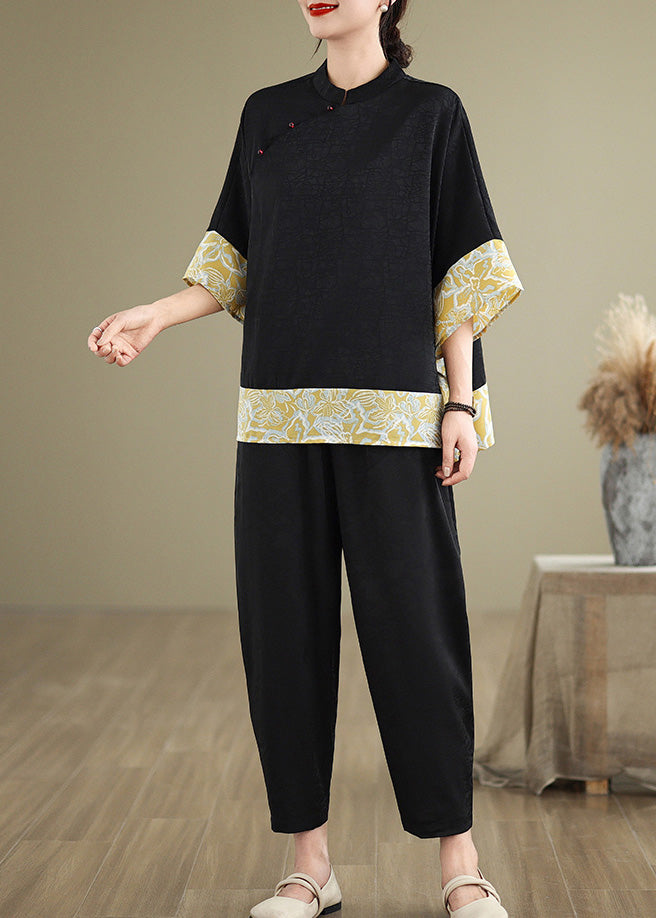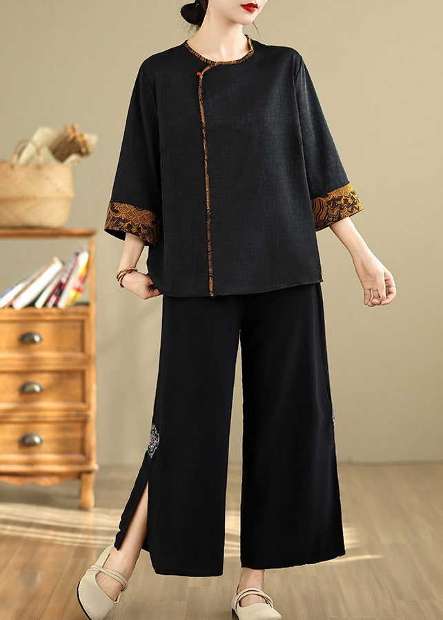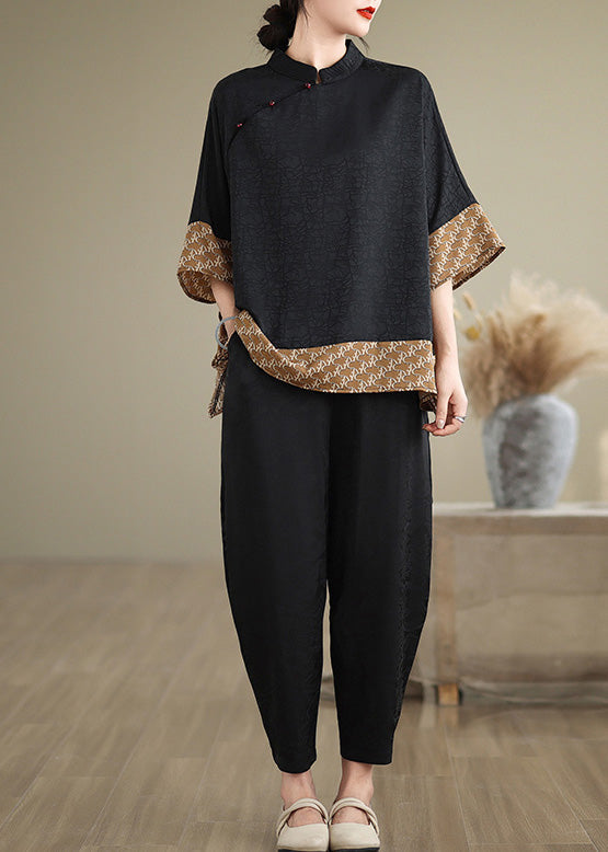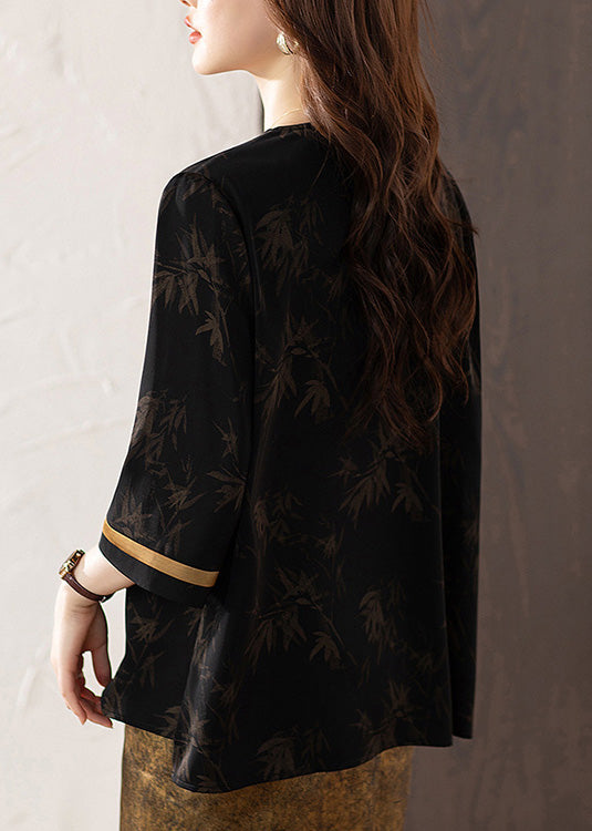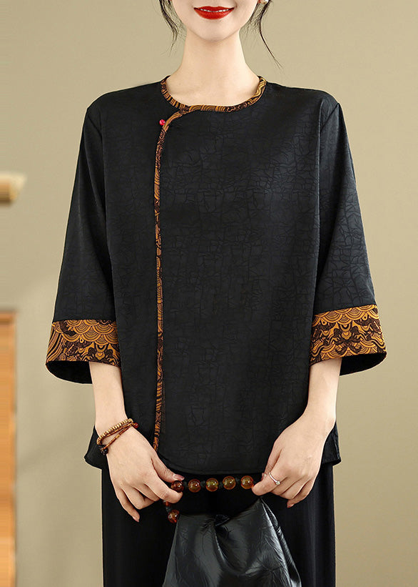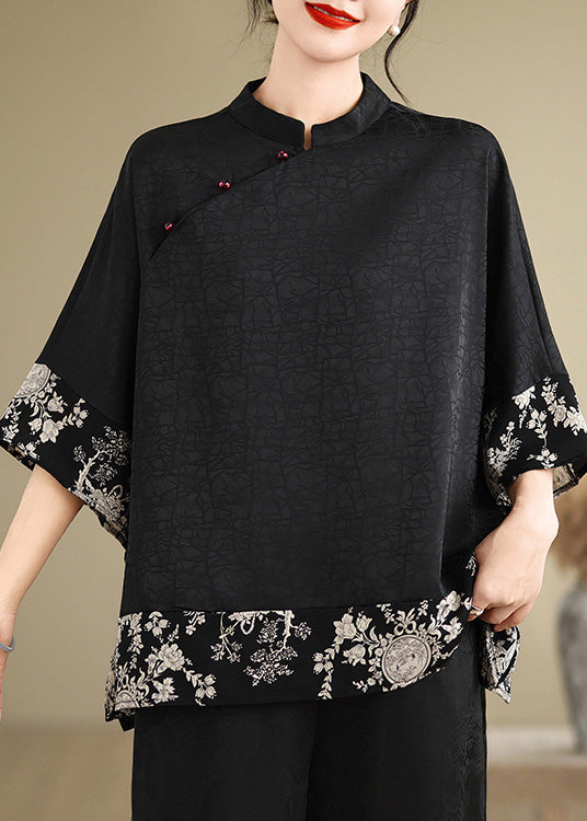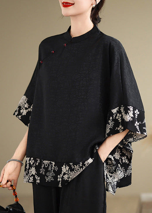 Vintage Black Mandarin Collar Patchwork Silk Shirt Summer