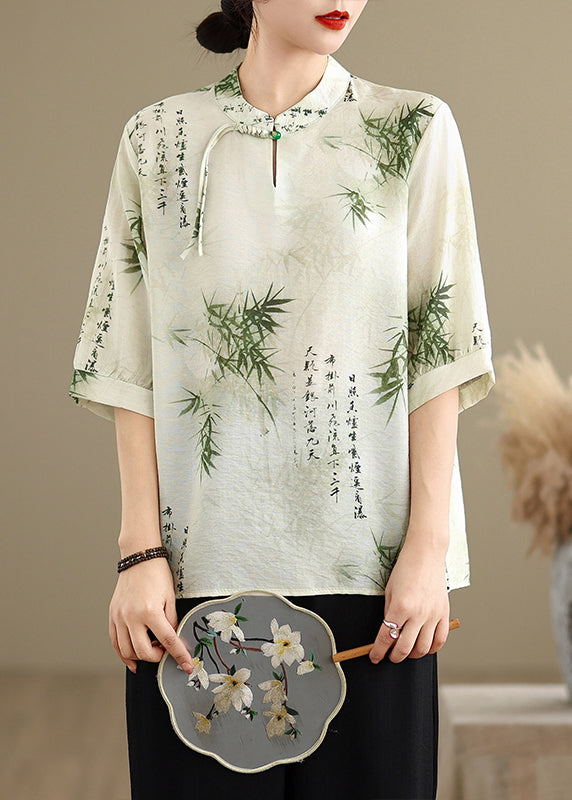 New Retro Bamboo Print Chiffon Oriental Tops Half Sleeve