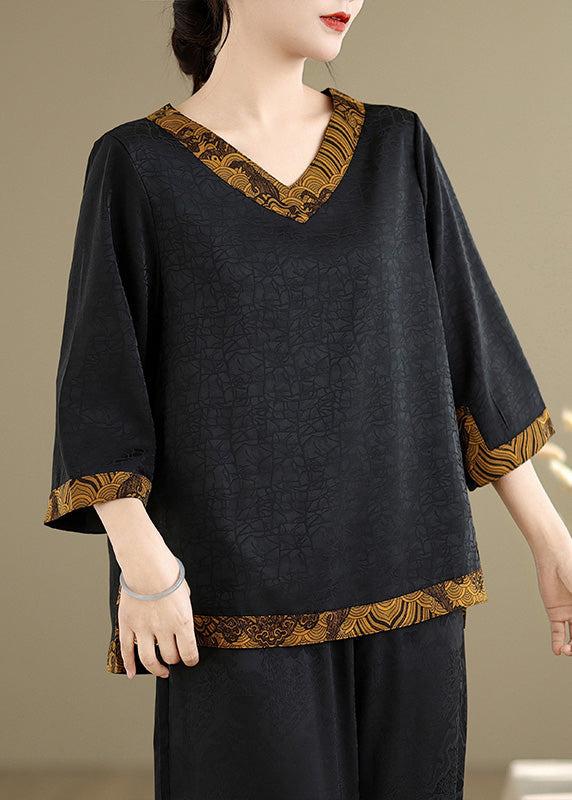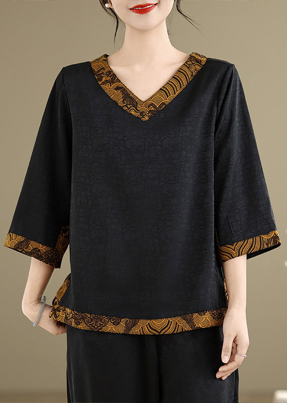 Boutique Black V Neck Patchwork Silk Shirts Half Sleeve