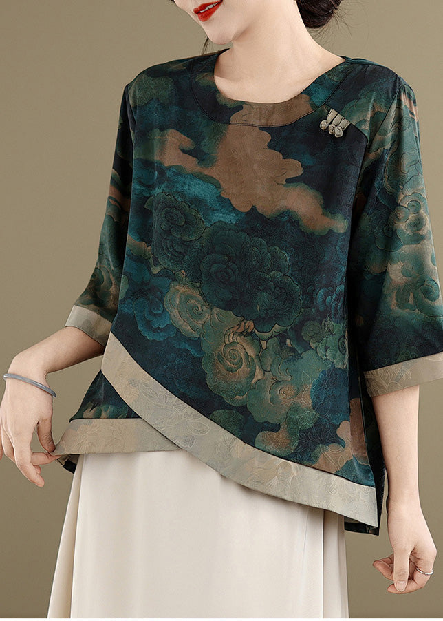 Vintage Green Asymmetrical Print Silk Blouses Half Sleeve