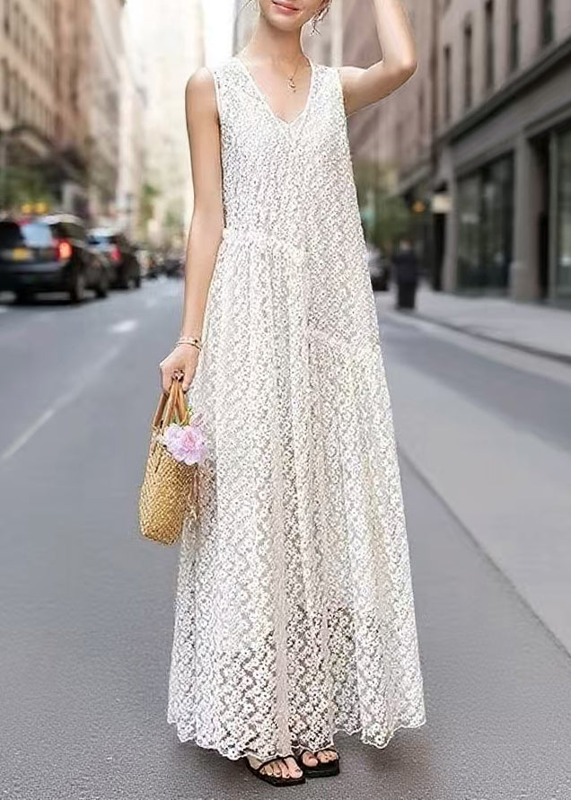 Boutique White Embroidered Hollow Out Tulle Robe Dresses Sleeveless