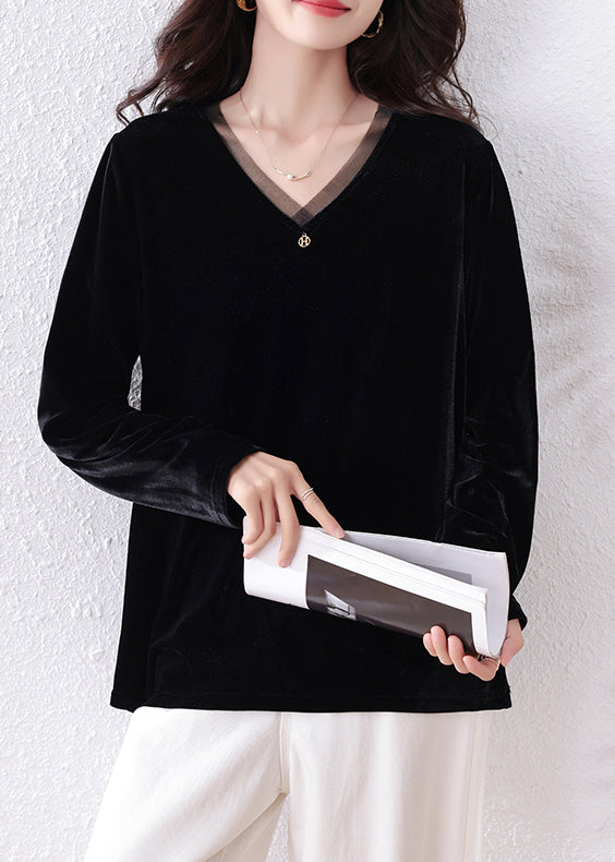 Beautiful Black V Neck Patchwork Silk Velour Shirt Tops Fall