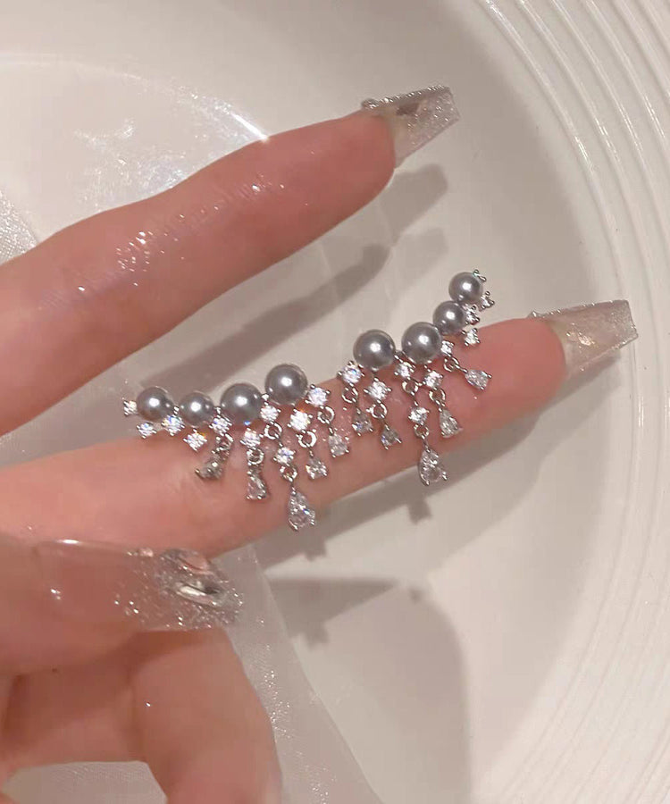 Classy Grey Copper Overgild Zircon Pearl Tassel Stud Earrings
