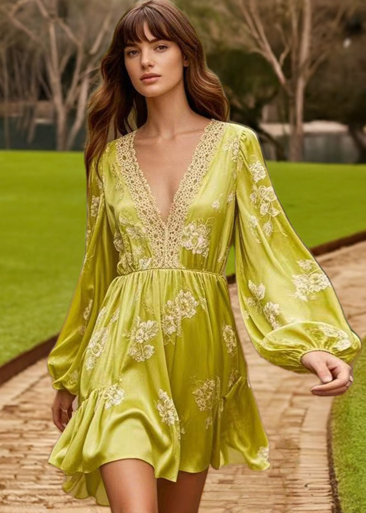 Women Yellow Green V Neck Print Patchwork Silk Mid Dresses Spring