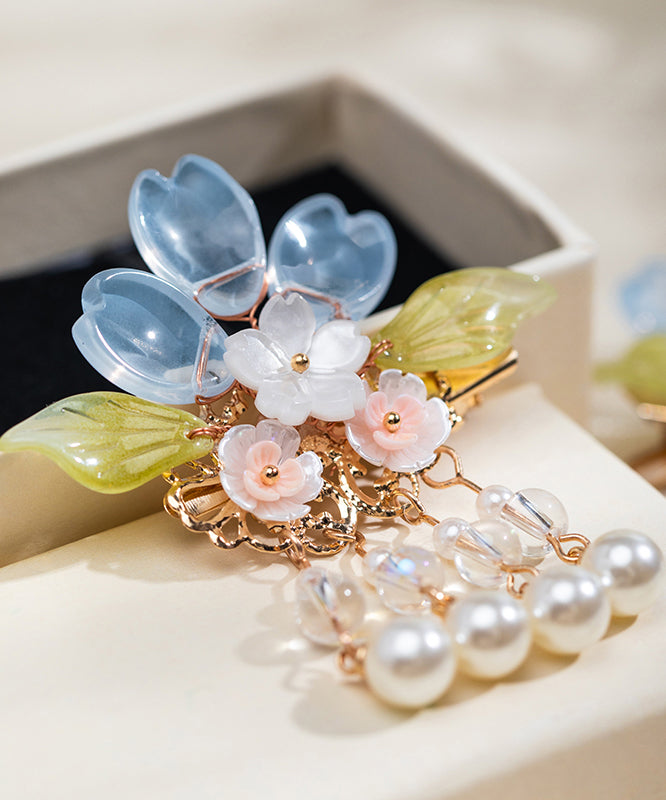 Retro Blue Alloy Pearl Cloisonne Floral Tassel Hairpin