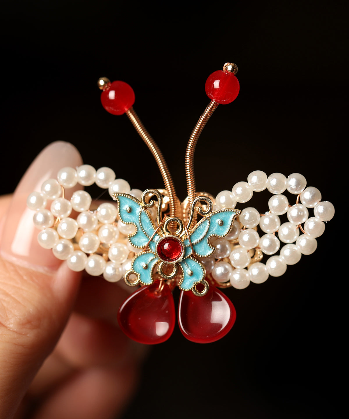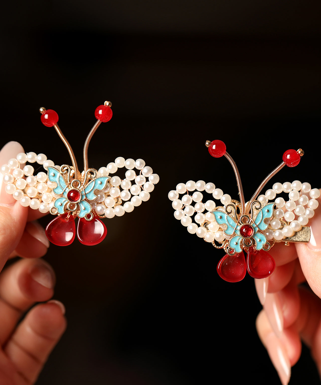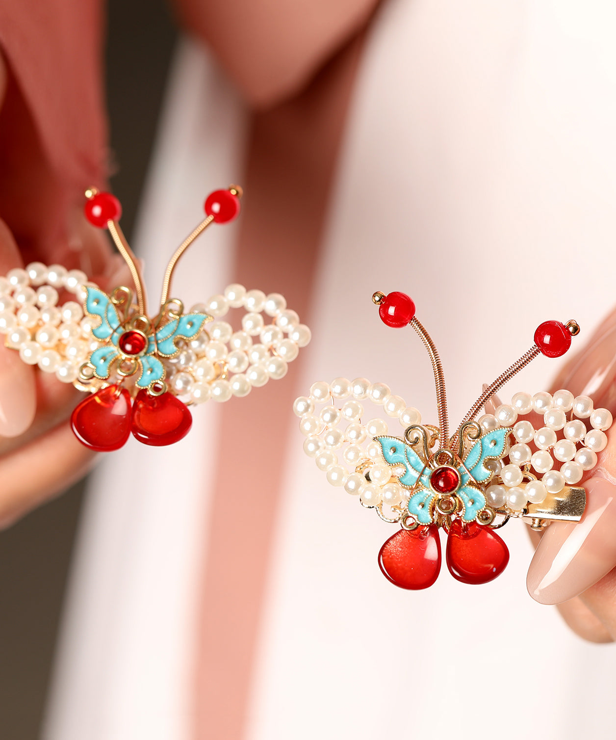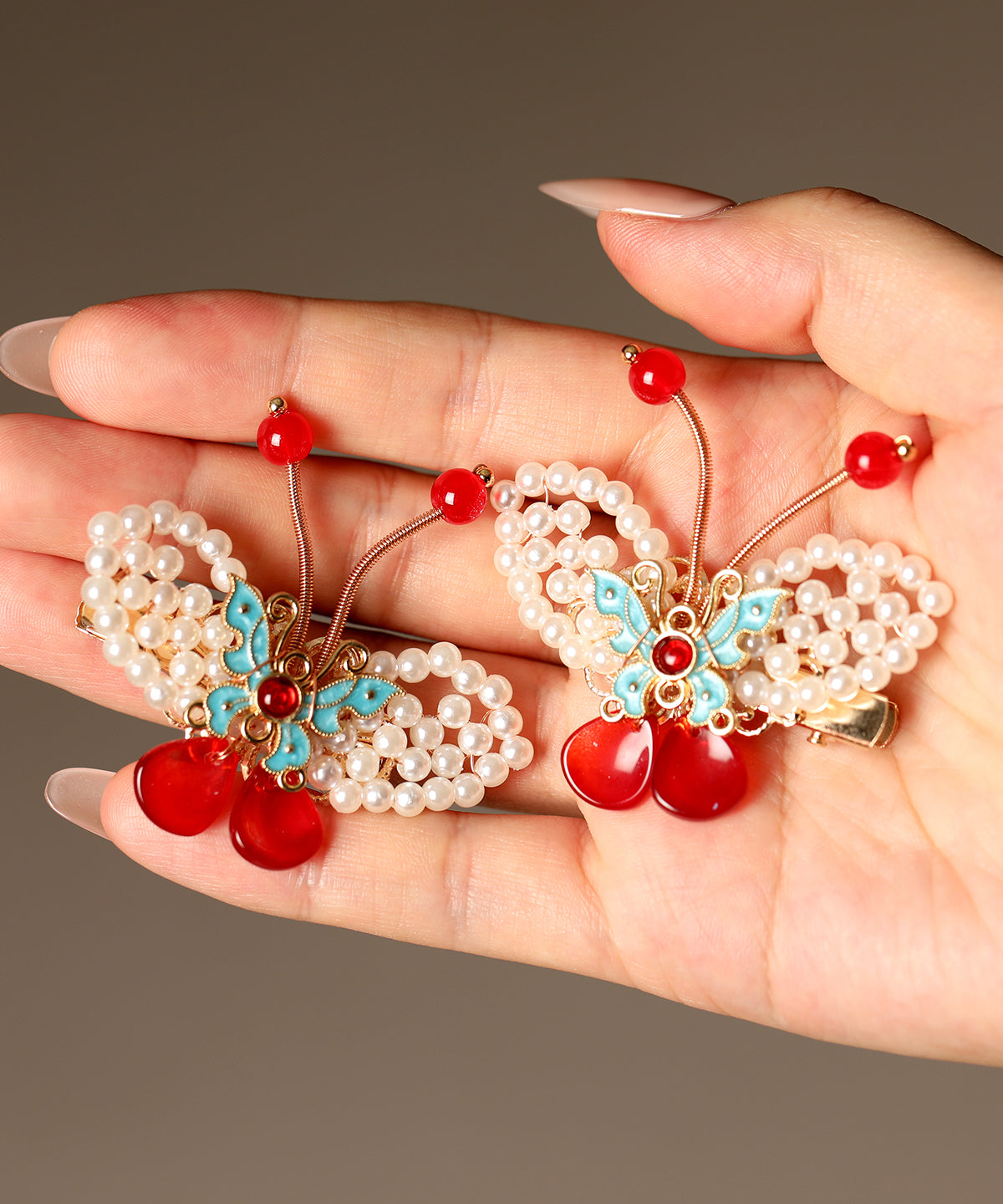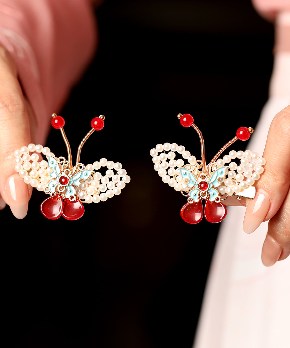 Vintage Red Alloy Pearl Colored Glaze Butterfly Kids A Pair Hairpin