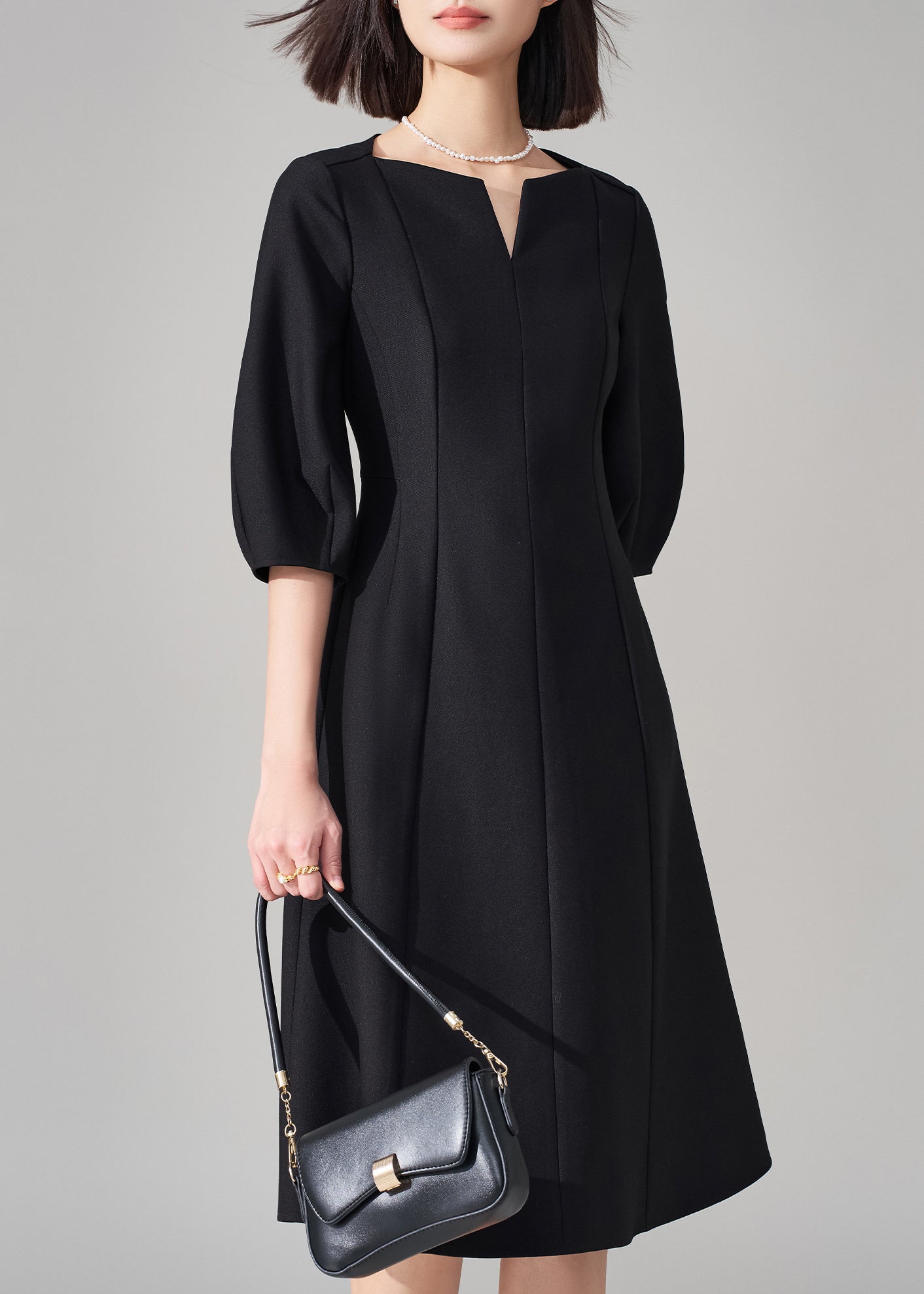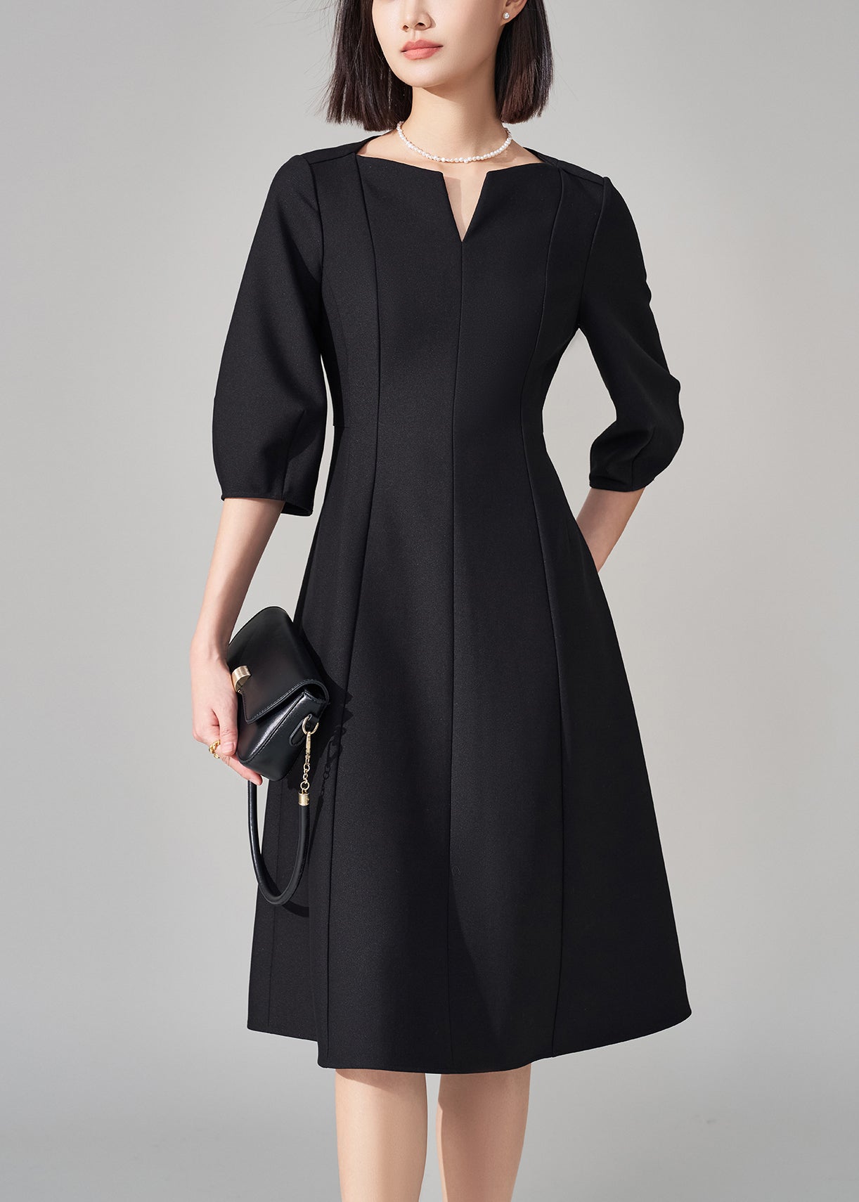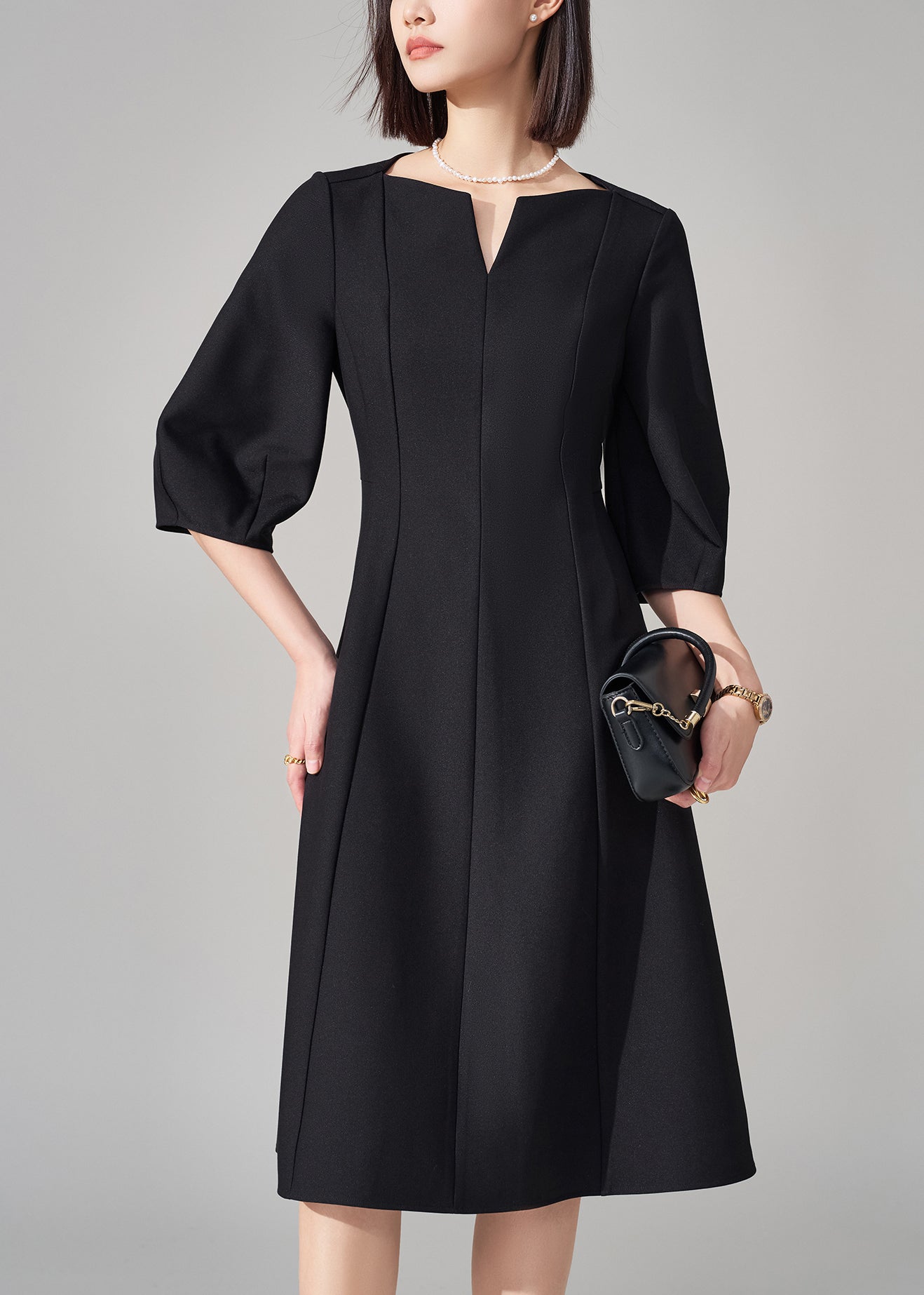 Fine Black V Neck Zippered High Waist Cotton Dresses Half Sleeve