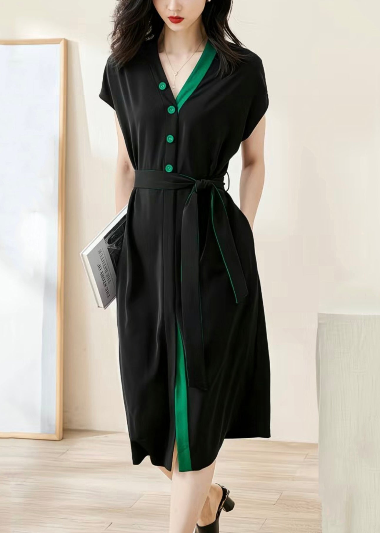 Loose Black V Neck Button Tie Waist Cotton Dresses Batwing Sleeve