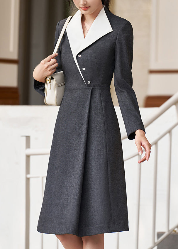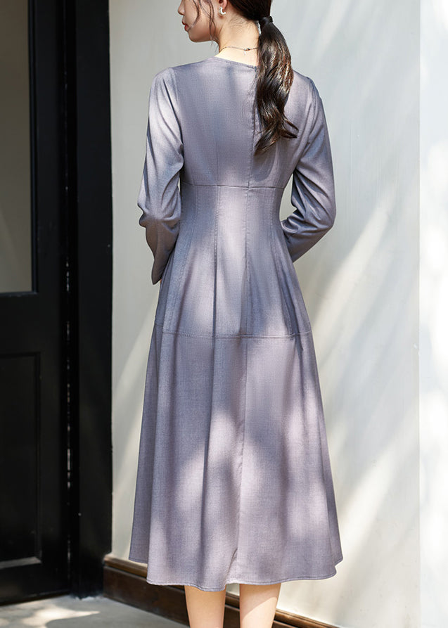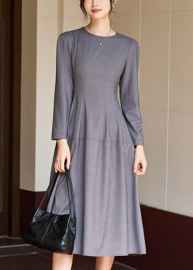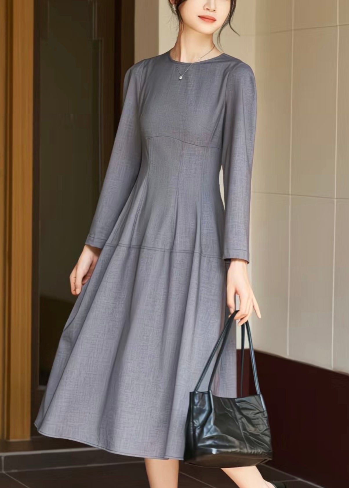 Women Grey O Neck High Waist Solid Woolen Long Dress Fall