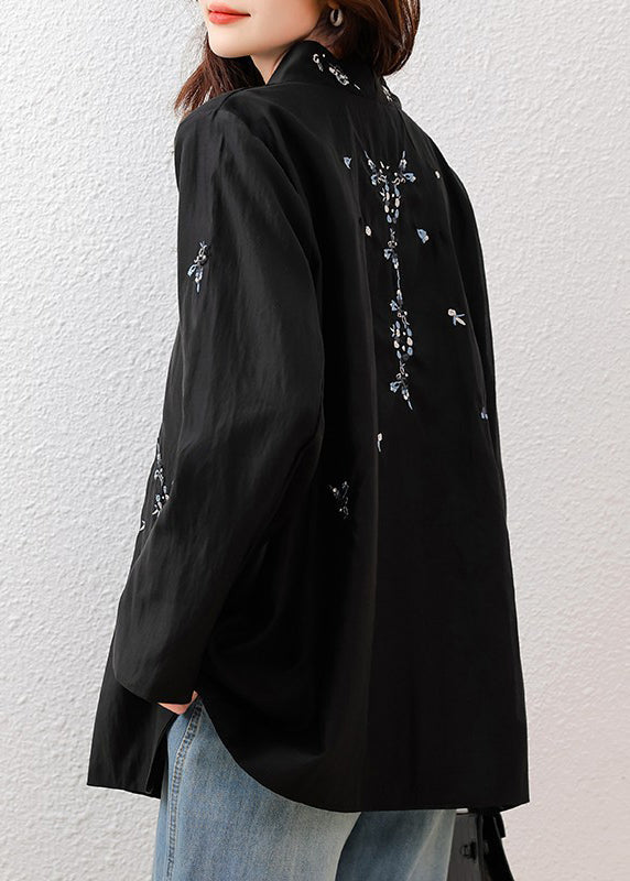 Chic Black Embroidered Chinese Button Cotton Shirt Top Fall