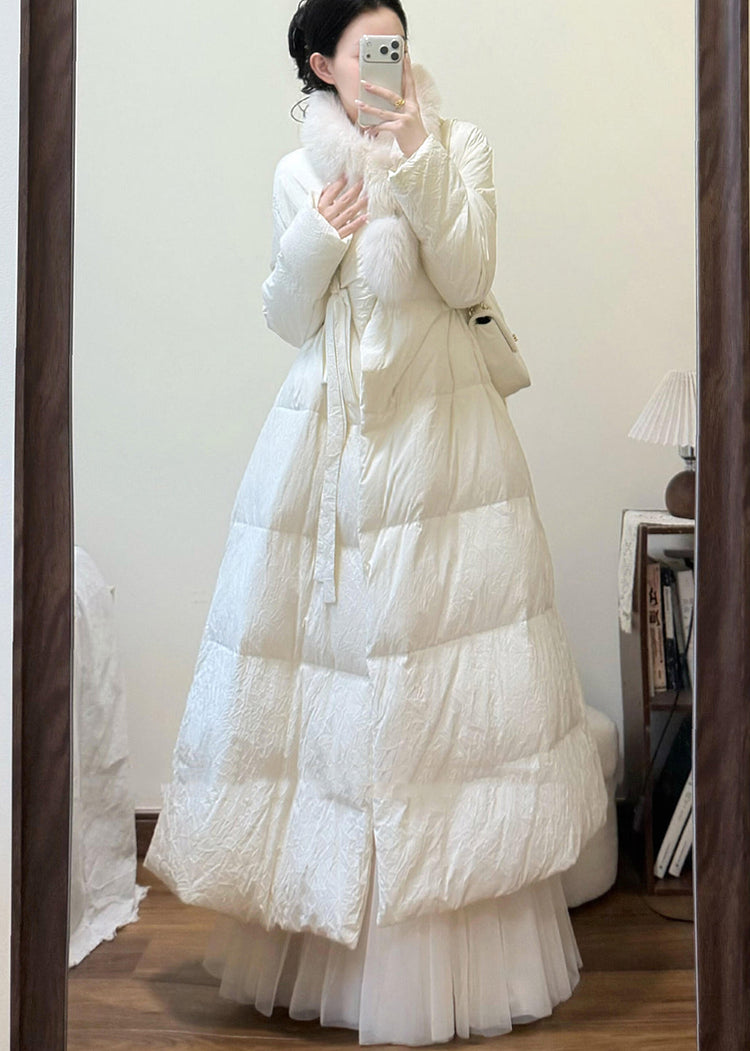 French White Fox Collar Tie Waist Duck Down Puffers Jackets Winter