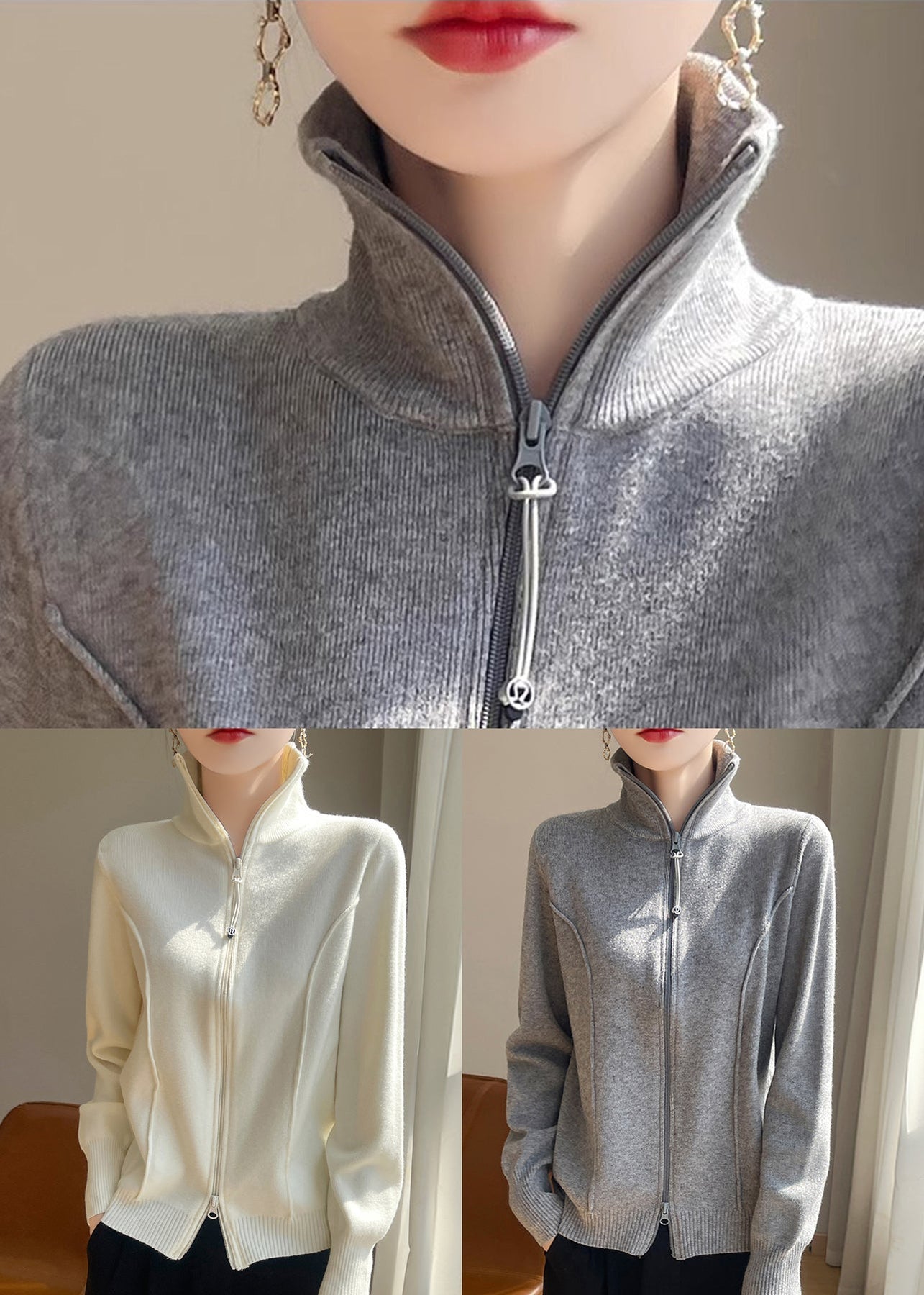 Slim Fit White Stand Collar Zip Up Solid Knit Coats Fall
