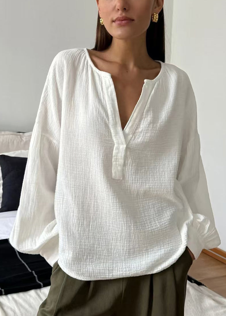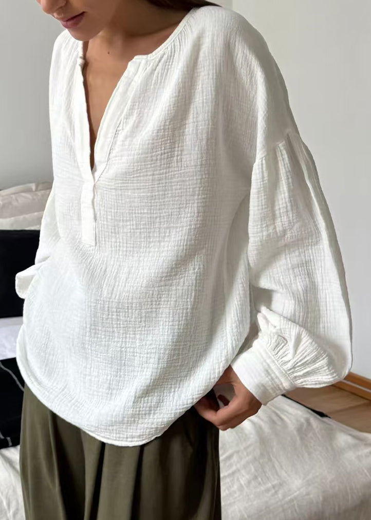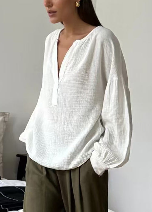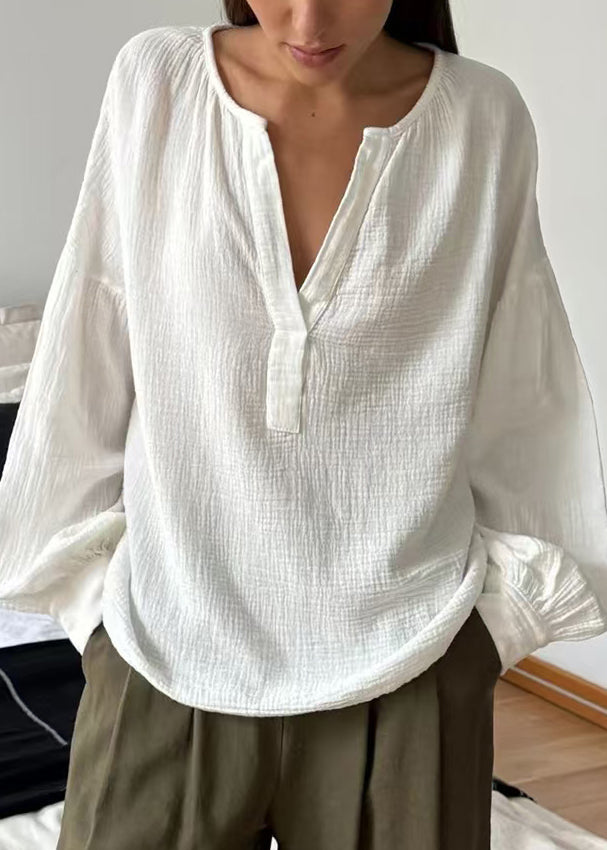 Plus Size White V Neck Solid Cotton Shirt Fall