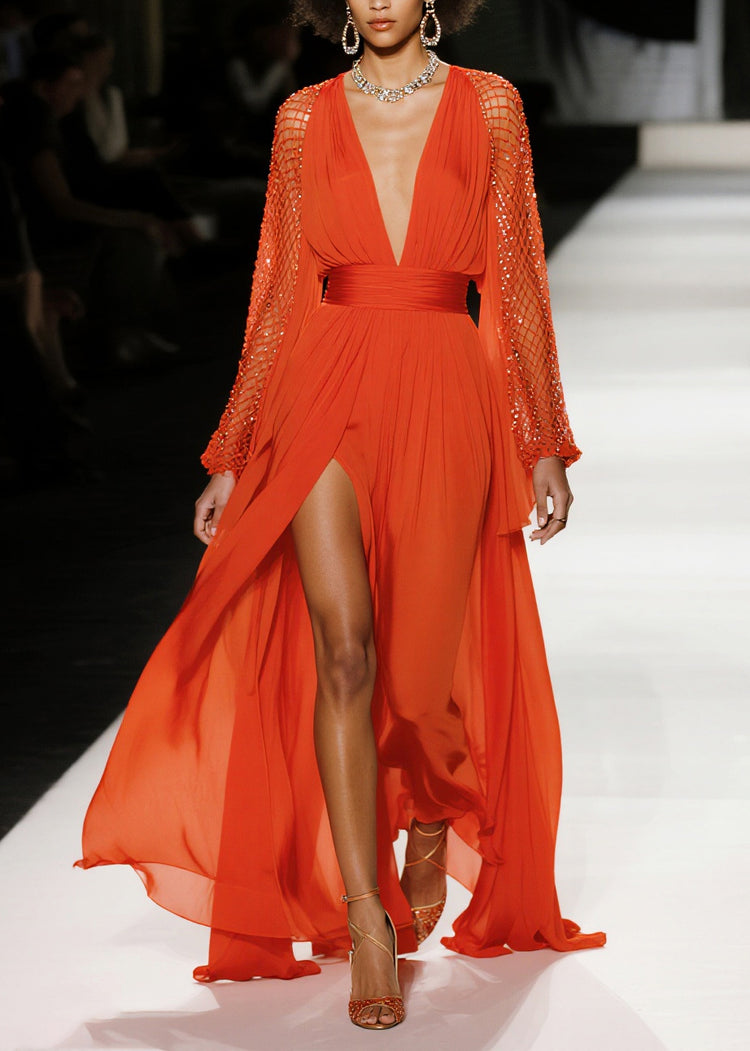 French Red Exra Large Hem Side Open Patchwork Mesh Chiffon Party Dresses Summer