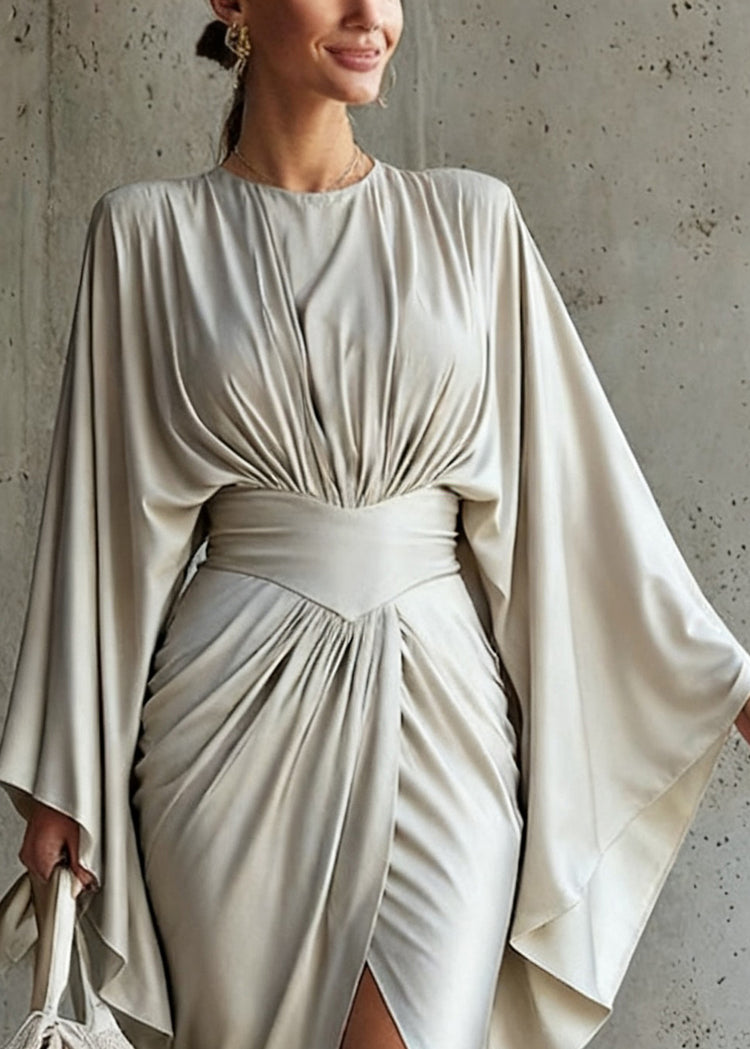 Italian Grey Wrinkled Side Open Long Dress Batwing Sleeve