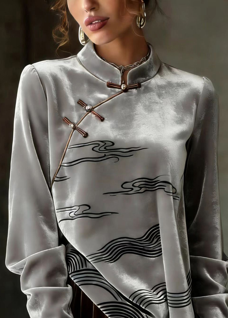 Chinese Style Grey Oriental Button Velour Shirts Spring